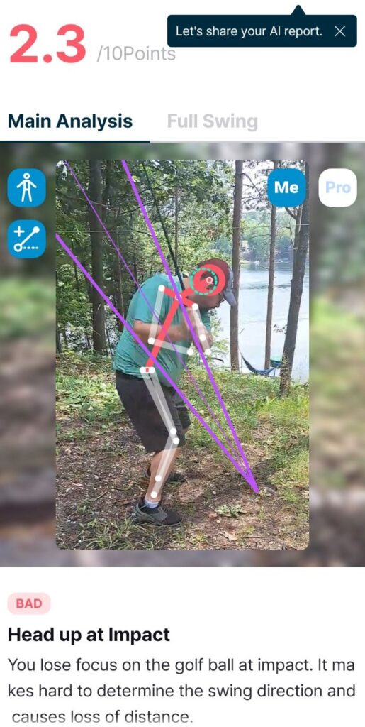 From a tech-nerd perspective, the tool was impressive. It broke my body down into a creepy little stick figure. Pins on my head. Pins on my knees. Swing plane overlays. Very CSI: Municipal Golf Course.