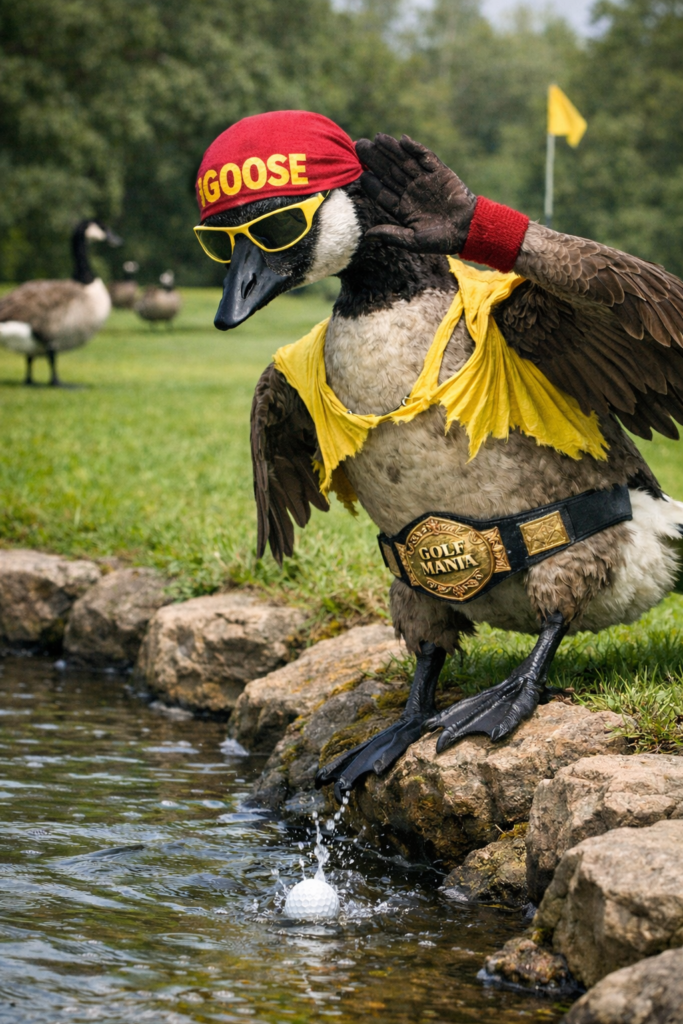 Instead, this goose goes full Hulk Hogan. Shirt rip. Wing to the ear. Picks up my golf ball in its bill, takes a few deliberate steps, and Stinky Leg drops it right into the creek.